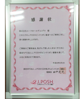 認定NPO法人 J.POSHピンクリボン募金への寄付に対し、深く感銘を受け、ご協力をさせていただきました。