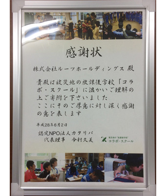 ホーム > CSR:社会貢献 > コラボ・スクール寄附金 CSR CSR:社会貢献 コラボ・スクール寄附金 被災地の放課後学校「コラボ・スクール」へ寄附を、ご協力をさせていただきました。災害を受けた学生たちに日常の学びをサポートをできればと、微力ではありますが寄付を致しまして、この度、御礼状を頂きました。 CSR ルーツグループのCSR 事業活動と社会的責任 環境への取り組み 人材を資産に 社会貢献 赤い羽根 クリック募金 持ち帰り清掃 人権啓発の推進 災害支援活動 環境保全 エコキャップ回収運動 国境なき医師団 ふるさとひめじ応援寄附金 宇和島城の城主証 益財団法人 日本ユニセフ協会 ピンクリボン寄附金 コラボ・スクール寄附金 白神山地財団 屋久島観光協会 お問い合わせはこちら